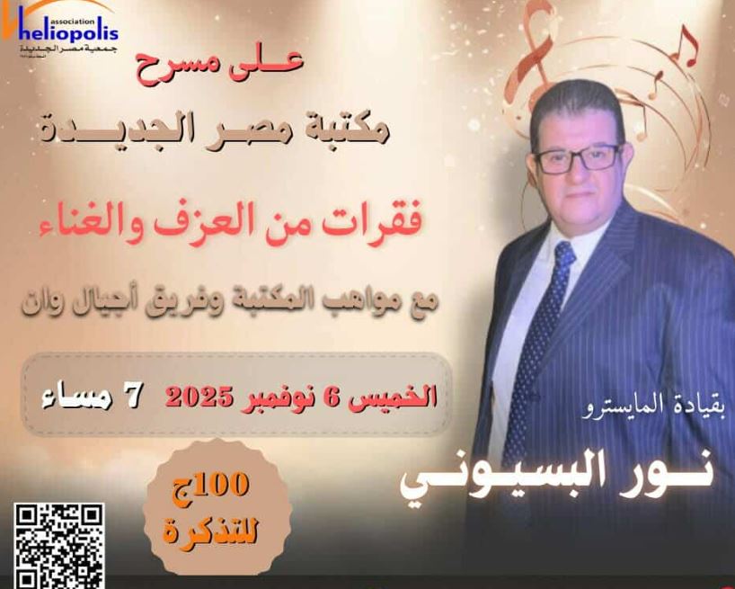 تنظم مكتبة مصر الجديدة العامة حفل موسيقي لمواهب المكتبة نتاج ورش لتعليم كل أنواع الآلات الموسيقية وعزف كورال وطبلة وغناء بقيادة الفنان نور البسيوني، وذلك يوم الخميس القادم فى الساعة السابعة من مساء.
