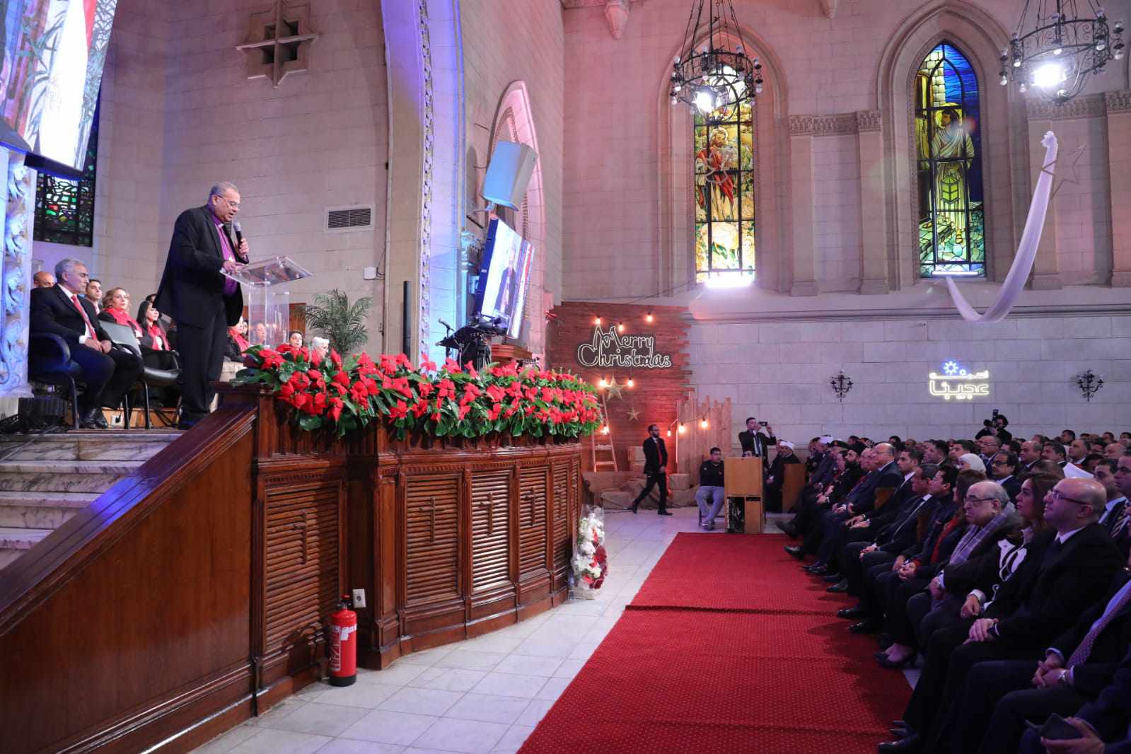 وقال رئيس الطائفة الإنجيلية، في كلمته، إن عيد الميلاد يأتي وسط عالمٍ مضطربٍ فهناك عدة أزمات، منها الحرب الروسية الأوكرانية، مما يؤدي إلى تزايد أعداد الضحايا واستمرار الأزمة الاقتصادية العالمية، وأيضا الحرب في غزة، حيث رأينا القوة الغاشمة لإسرائيل تفجر المنازل والمستشفيات مما أدى لاستشهاد الآلاف من الفلسطينيين ومنهم عدد كبير من النساء والأطفال وتدمير غزة بشكل غير مسبوق.