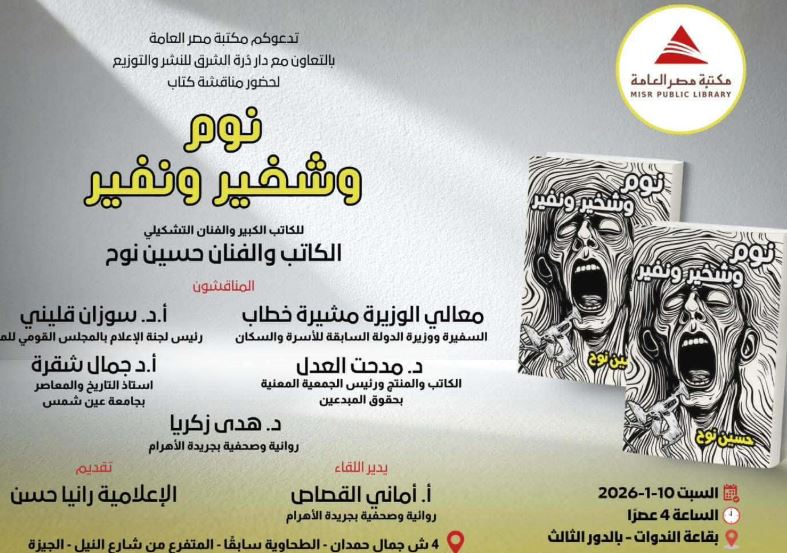 تنظم مكتبة مصر العامة مناقشة لكتاب «نوم وشخير ونفير» للكاتب والفنان حسين نوح، وذلك يوم السبت المقبل، في تمام الساعة الرابعة عصرًا، بمقر مكتبة مصر العامة، في إطار فعاليات المكتبة الثقافية الهادفة إلى فتح مساحات للحوار حول التجارب الإبداعية المعاصرة.