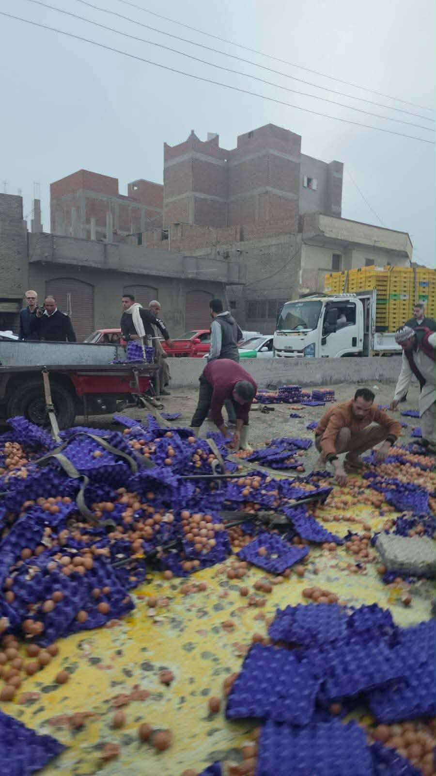 وبالفحص الأولي، تبين أنه أثناء سير السيارة في اتجاه محافظة القاهرة، اختلت عجلة القيادة في يد السائق نتيجة تفادي إحدى المركبات، ما أدى إلى انحراف الشاحنة وانقلابها على جانب الطريق، مسببة تحطم مئات الآلاف من البيض التي غطت مساحة واسعة من الطريق الأسفلتي.
