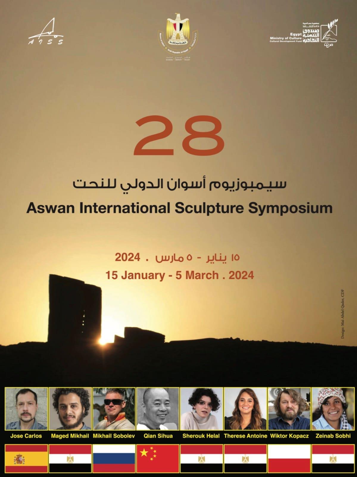 ويشارك في فعاليات الدورة الـ28 لسمبوزيوم أسوان الدولي، 12 نحات منهم 5 أجانب و4 مصريين و3 ضمن الورش الفنية، حيث إنهم أبدعوا في إنتاج عدد من القطع الفنية المبهرة المعتمدة في صناعتها على خامة الجرانيت الأسواني وغيرها من الخامات.