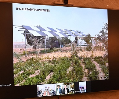 واستعرض الحضور مشروعًا مبتكرًا يُعد الأول من نوعه في قارة أفريقيا، يقوم على دمج الألواح الشمسية مع الأراضي الزراعية (Agri-PV)، بما يحقق الاستخدام المزدوج للأراضي من خلال توليد الطاقة المتجددة وزراعة المحاصيل في نفس المساحة، في إطار مواجهة تحديات التغير المناخي، وحماية المحاصيل، وتقليل استهلاك المياه، وتوفير طاقة نظيفة لتشغيل محطات التحلية الزراعية.