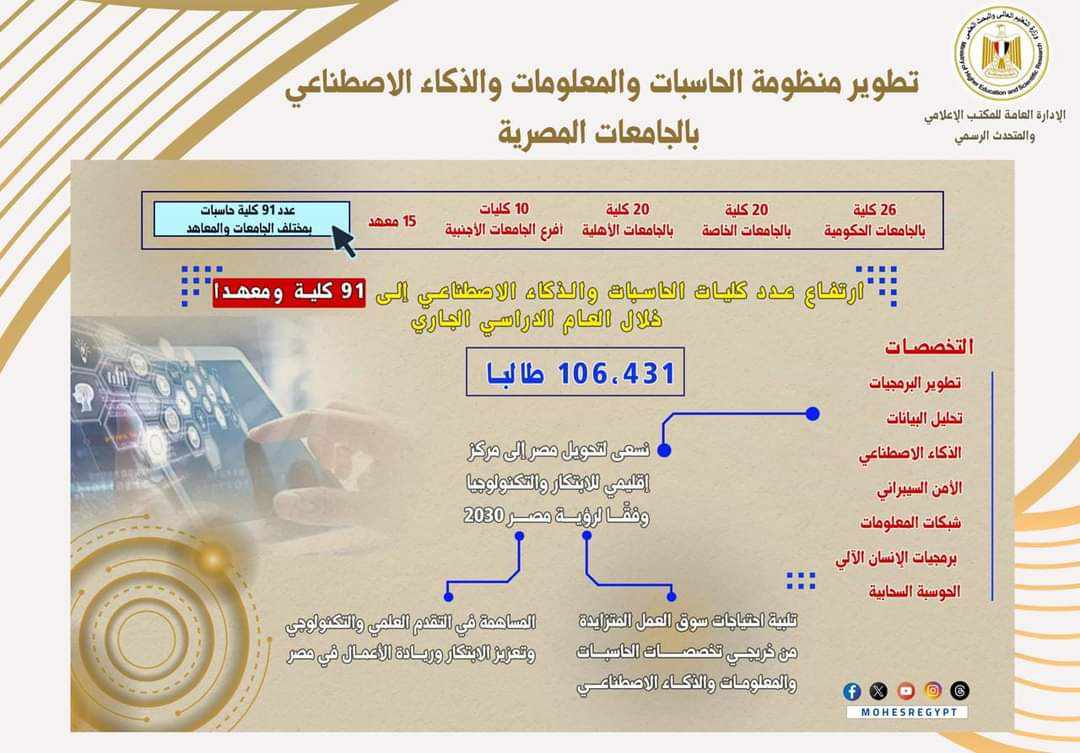 وأشار الوزير إلى أن هذه الكليات والمعاهد تتوزع على النحو التالي: (26 كلية حاسبات ومعلومات وذكاء اصطناعي في 27 جامعة حكومية، و20 كلية حاسبات ومعلومات وذكاء اصطناعي في 32 جامعة خاصة، و20 كلية للحاسبات والمعلومات والذكاء الاصطناعي في 20 جامعة أهلية، و15 معهدًا للحاسبات والمعلومات في المعاهد العليا الخاصة، و10 كليات حاسبات وذكاء اصطناعي بالجامعات المنشأة باتفاقيات دولية وأفرع الجامعات الأجنبية.