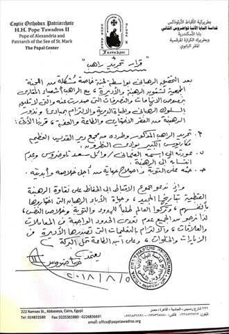 قرر البابا تواضروس الثاني بابا الإسكندرية بطريرك الكرازة المرقسية، بعد التحقيق الرهباني بواسطة لجنة خاصة مشكلة من اللجنة المجمعية لشئون الرهبنة والأديرة، مع الراهب أشعياء المقاري بخصوص الاتهامات والتصرفات التي صدرت عنه، والتي لا تليق بالسلوك الرهباني والحياة الديرية والالتزام بمبادئ ونذور الرهبنة من الفقر الاختياري، تجريد الراهب المذكور وطرده من مجمع دير القديس العظيم مكاريوس الكبير بوادي النطرون، وعودته إلى اسمه العلماني «وائل سعد تاوضروس» وعدم انتسابه إلى الرهبنة، وحثه على التوبة، وإصلاح حياته من أجل خلاصه وأبديته.