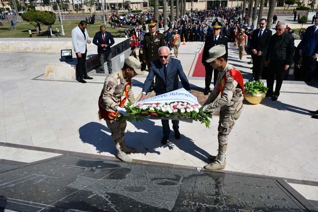وضع اللواء عادل الغضبان، محافظ بورسعيد، إكليل من الزهور على النصب التذكاري بساحة ميدان الشهداء، في حديقة المسلة بنطاق حي الشرق؛ احتفالا بذكرى اليوبيل الذهبي لانتصارات أكتوبر، كما عزفت الموسيقى العسكرية سلام الشهيد.