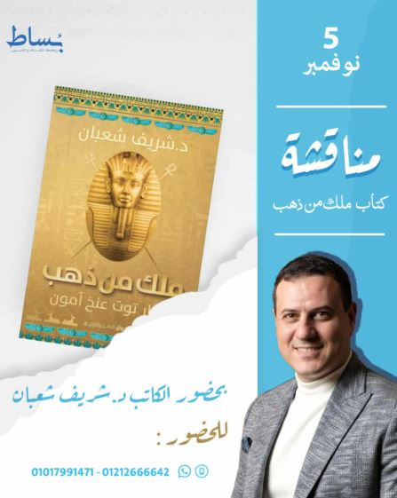 ينظم مركز بساط الثقافي اليوم الأربعاء ندوة لمناقشة كتاب "ملك من ذهب.. أسرار توت عنخ آمون"، للكاتب الدكتور شريف شعبان، والصادر عن دار الرواق للنشر، وذلك في الساعة السابعة مساء.