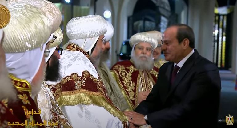 حيّا الرئيس عبد الفتاح السيسي وصافح، جمع الإخوة المسيحينين المحتفلين بعيد الميلاد في كاتدرائية ميلاد المسيح بالعاصمة الإدارية الجديدة.