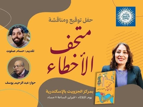 يستضيف مركز الجزويت في الإسكندرية يوم الثلاثاء، 10 فبراير، حفل توقيع ومناقشة المجموعة القصصية"متحف الأخطاء"، للكاتبة منصورة عز الدين، والصادرة عن دار الشروق، وذلك في تمام الساعة 7 مساءً.