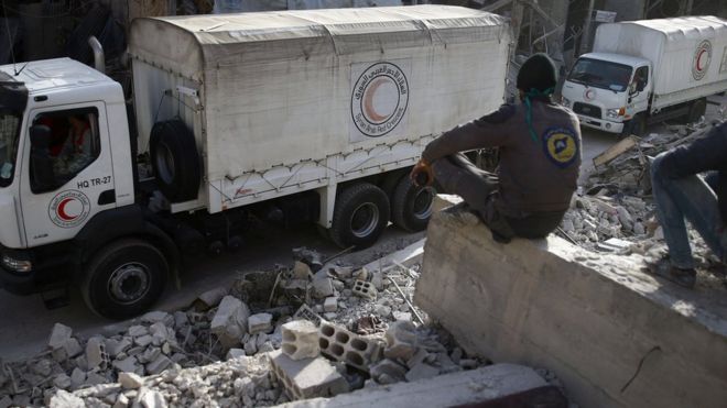 وأعلن الهلال الأحمر السوري في وقت سابق دخول 46 شاحنة محملة بالمواد الغذائية وإيصالها لنحو 27 ألف شخص، فضلاً عن مواد طبية لأكثر من 70 ألف شخص ببلدة دوما.