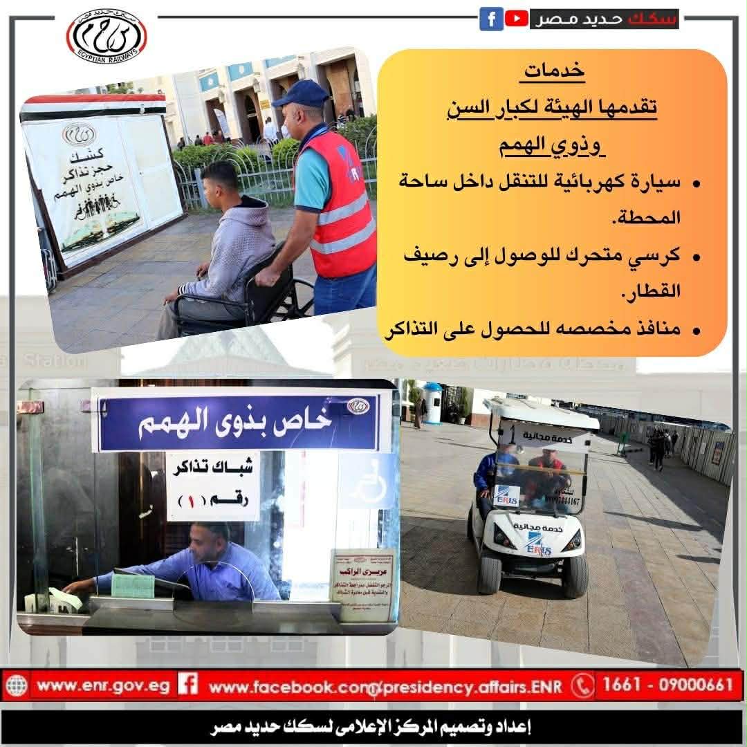 أكدت الهيئة القومية لسكك حديد مصر حرصها على الارتقاء بالخدمات المقدمة لكبار السن وذوي الهمم، انطلاقا من مسئوليتها المجتمعية واهتمامها بتعزيز حقوقهم وتقديم خدمات أكثر ملاءمة لهم سواء داخل المحطات أو على متن القطارات، وذلك تنفيذا لتوجيهات وزارة النقل.