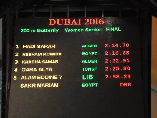 حققت رويدا هشام المركز الثاني والميدالية الفضية في سباق 400 متر متنوع سيدات في البطولة العربية الثالثة للسباحة المقامة في دبي بالإمارات.
