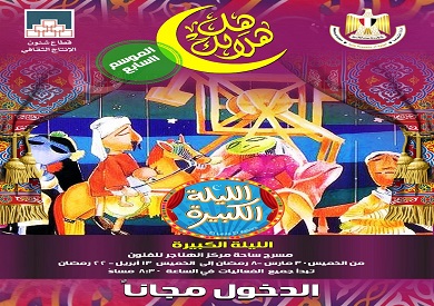 ويستهل برنامج هل هلالك بداية من اليوم الأول وحتى نهايته، بمشاركة من البيت الفني للمسرح، لرائعة الشاعر صلاح جاهين، والموسيقار سيد مكاوي، وعرض العرائس الشهير أوبريت الليلة الكبيرة، بالإضافة إلى ورش فنية بركن الطفل تحت إشراف الفنانة سها كحيل، وذلك في إطار اهتمام القطاع بالطفل وتنمية قدراته.