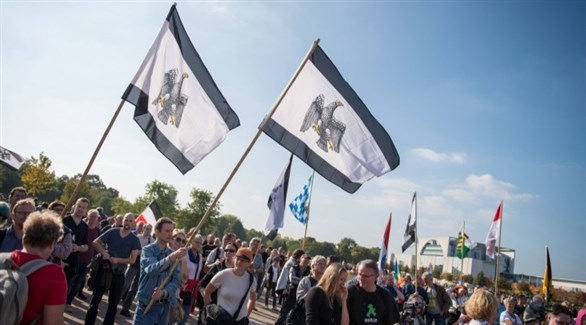 وكان بعض المشاركين في المظاهرة يحملون أعلاما بالألوان الأسود والأبيض والأحمر، وهي ألوان علم القيصرية الألمانية، وكان بعضهم يرتدي قمصانا تحمل رموزا رقمية تميز التيار اليميني المتطرف.