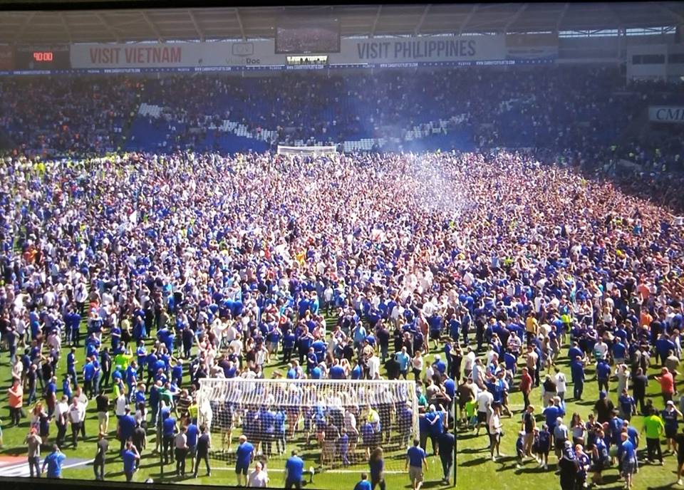 واجتاحت الجماهير أرض ملعب "كارديف" بعد تأهلهم رسميآ إلي الدوري الأقوي فى العالم بعد تعادلهم أمام ريدينج فى مباراة اليوم.