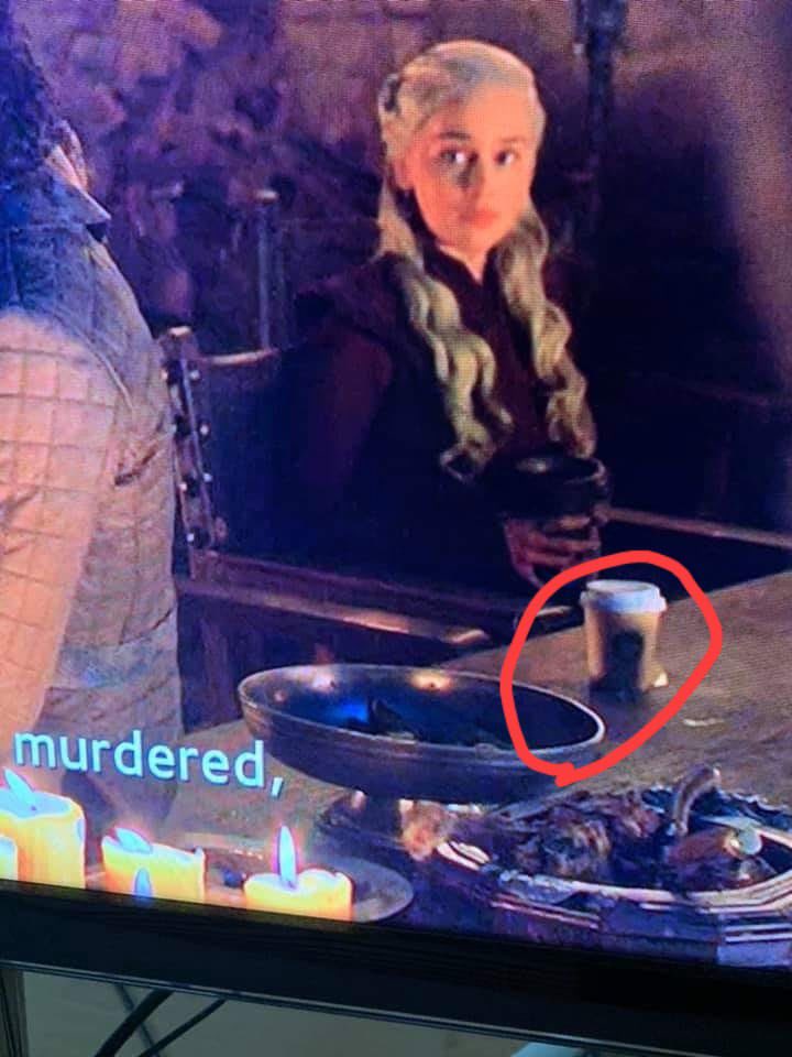 كوب القهوة حمل علامة تجارية شهيرة وهي "ستاربكس"، وهو المشروب الذي اعتادت إيميليا كلارك -التي تقوم بدور ديناريس- على حمله في كواليس تصوير المسلسل، وفي الفيديوهات التي تنتشر عبر مواقع التواصل الاجتماعي؛ ما يعني أنها المسئولة الأولى عن هذا الخطأ.