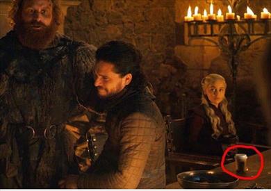فوجىء مشاهدو الحلقة الرابعة من الجزء الثامن والأخير، بوجود كوب قهوة على الطاولة التي وضعت أمام الملكة ديناريس تارجريان أو "أم التنانين" كما يطلق عليها، أثناء احتفال جيش الشمال أو ما تبقى منه بفوزهم على جيش الموتى وقتل النايت كينج.