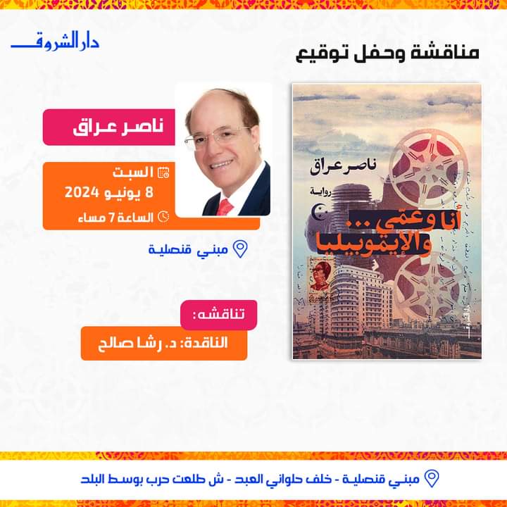 تنظم دار الشروق حفل توقيع ومناقشة رواية أنا وعمي والإيموبيليا، للروائي ناصر عراق، السبت المقبل، في تمام الساعة السابعة مساء، في مبنى قنصلية بوسط البلد، ومن المقرر أن تناقش الرواية الناقدة رشا صالح.