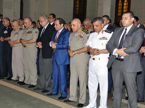 ويحضر الصلاة برفقة الرئيس المهندس شريف إسماعيل رئيس الوزراء والفريق أول صدقي صبحي وزير الدفاع والإنتاج الحربي والوزراء، والفريق محمود حجازي، رئيس أركان حرب القوات المسلحة، وعدد من قيادات القوات المسلحة.