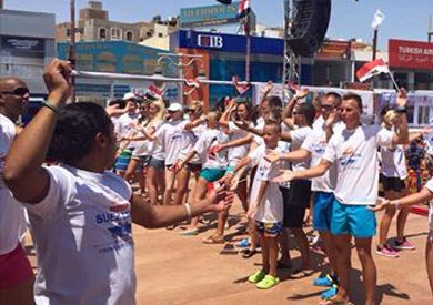 ورفع المئات الأعلام الخاصة بمصر وقناة السويس وصور القناة والرئيس السيسي، وغطت واجهات الفنادق والقرى السياحية بالغردقة.
