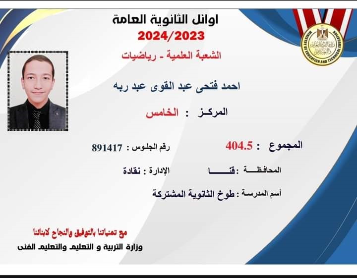 "الشروق" تواصلت مع الطالبين، وأكد الطالب أحمد فتحي، أن والده يعمل مهندسا ووالدته معلمة، وأن تفوقه جاء نتيجة مجهود كبير وفرته أسرته له حيث حصل على مجموع 404.5، لافتا إلى أنه لم يكن يتوقع أن يكون من بين أوائل الثانوية العامة.