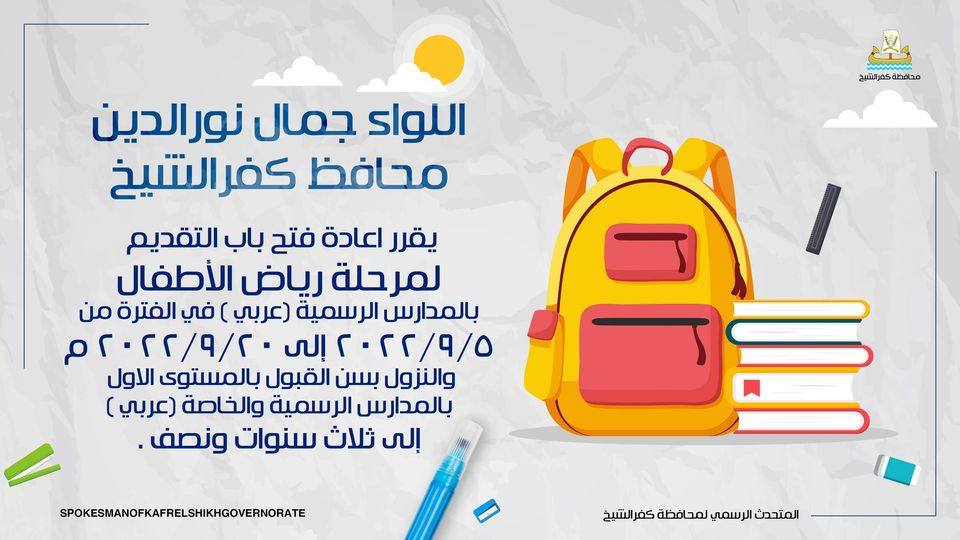 كما قرر محافظ كفر الشيخ النزول بسن القبول برياض الأطفال بالمدارس الرسمية والخاصة "عربي" لـ 3 سنوات ونصف، بدلا من 4 سنوات.