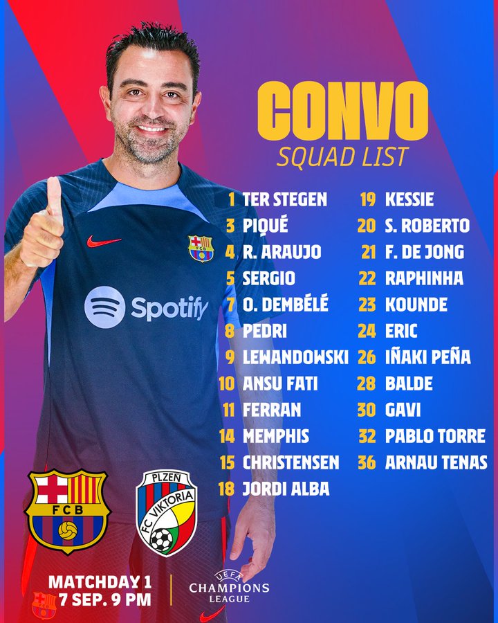 أعلن تشافي هيرنانديز، المدير الفني لبرشلونة، قائمة فريقه لمباراة فيكتوريا بلزن، غدًا الأربعاء، على ملعب كامب نو، في مستهل مشوار البلوجرانا بدور المجموعات بدوري أبطال أوروبا 2023/2022.