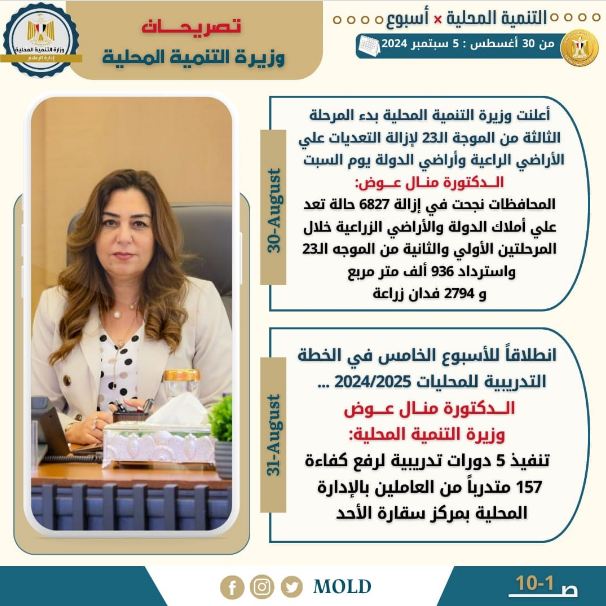 نقدم فيما يلي أبرز ما تضمنه التقرير المنشور على الصفحة الرسمية للوزارة على موقع التواصل الاجتماعي "فيس بوك": الجمعة 30 أغسطس: بدء المرحلة الثالثة من الموجة الـ23 لإزالة التعديات أعلنت الدكتورة منال عوض عن انطلاق المرحلة الثالثة والأخيرة من الموجة الـ 23 لإزالة التعديات على الأراضي المملوكة للدولة والأراضي الزراعية، والتي تبدأ يوم السبت 31 أغسطس وتستمر حتى 20 سبتمبر 2024.