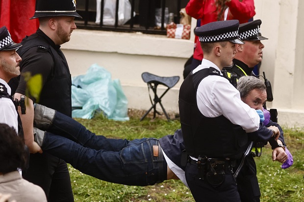 اعتقلت الشرطة البريطانية، أربعة متظاهرين اليوم السبت، بعد قيامهم بإلقاء الطعام على حاوية مجوهرات التاج الثمينة المرصعة بالماس، في برج لندن.