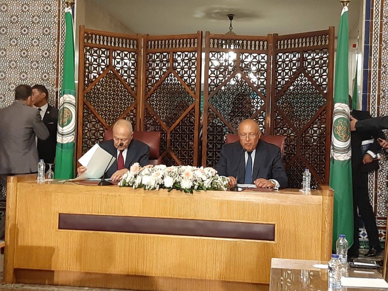 انطلقت، اليوم، أعمال المؤتمر الصحفي لكل من وزير الخارجية سامح شكري والأمين العام لجامعة الدول العربية أحمد أبو الغيط، وذلك في ضوء مخرجات الجلسة الطارئة لمجلس الجامعة العربية على مستوى وزراء الخارجية العرب برئاسة مصر.