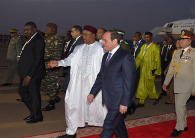 ووصل الرئيس عبد الفتاح السيسي، مساء أمس السبت إلى النيجر، للمشاركة في القمة الإفريقية الاستثنائية، وأقيمت مراسم استقبال رسمية له لدى وصوله مطار نيامي، حيث كان في استقباله رئيس النيجر محمد يوسفو.