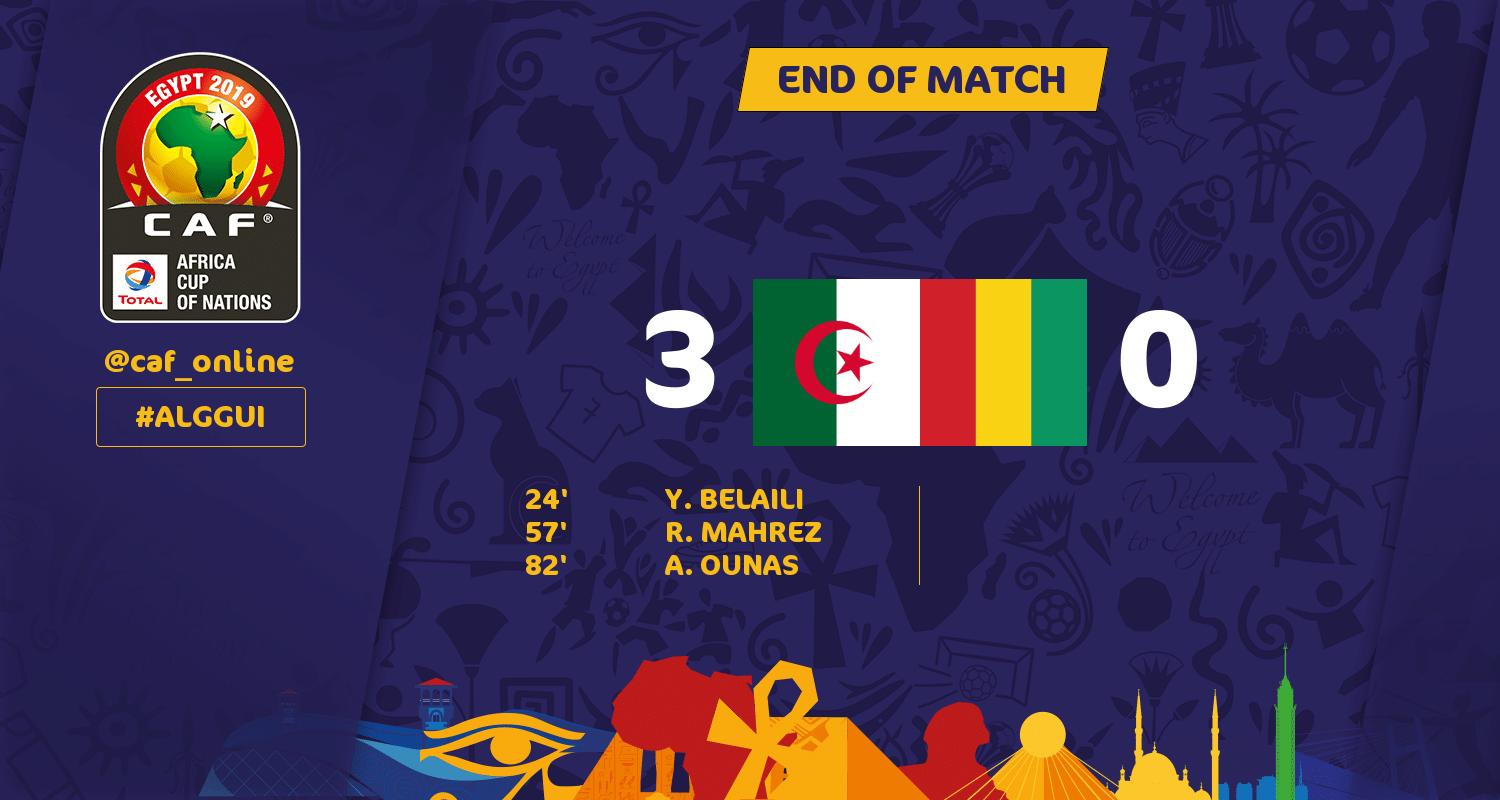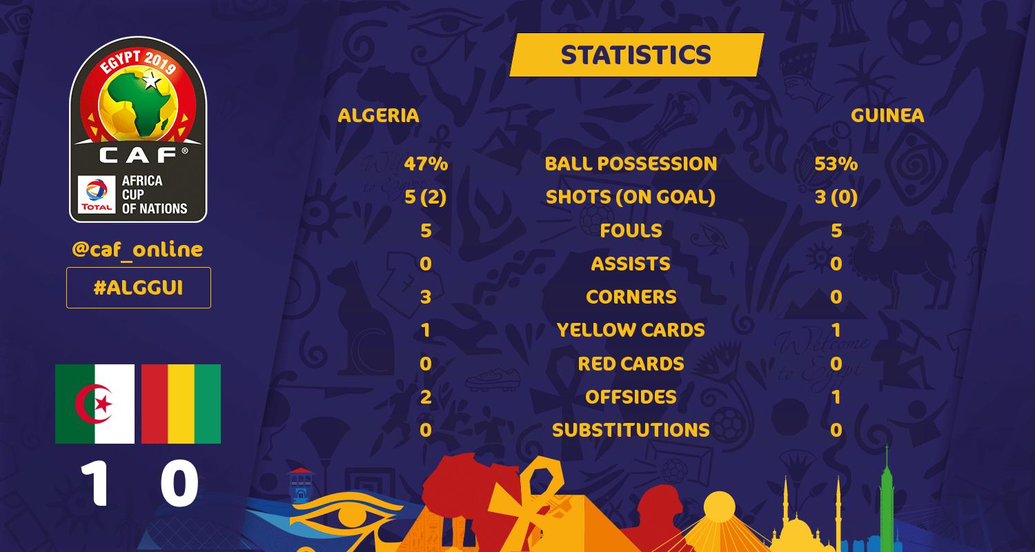 - الدقيقة 10 بغداد بونجاح لاعب منتخب الجزائر يسدد كرة لكن تخرج بجوار الجانب الأيمن لمرمى منتخب غينيا