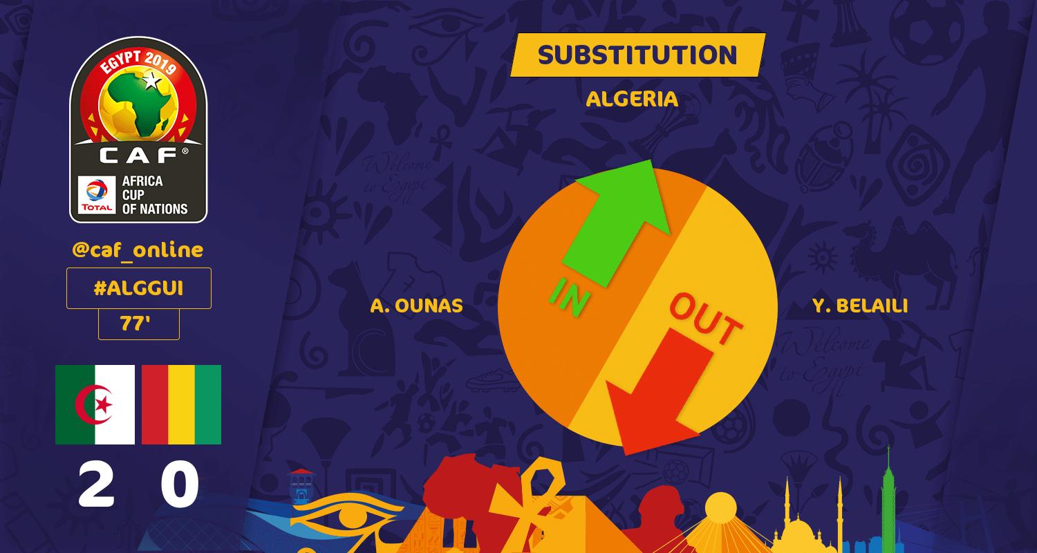 - الدقيقة 77 التبديل الأول لمنتخب الجزائر بخروج يوسف البلايلي ونزول أدم وناس