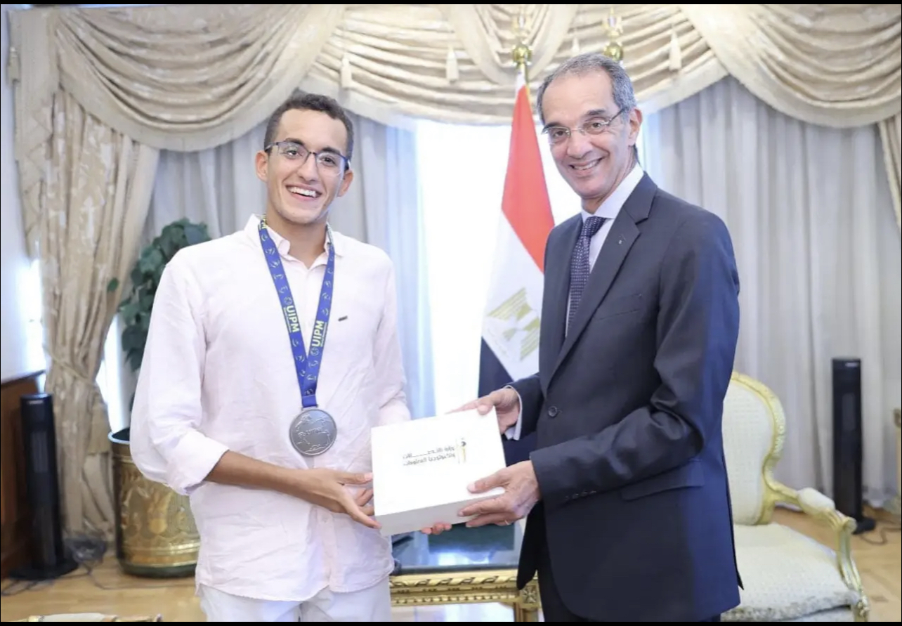 جاء ذلك خلال تكريم الوزير، اليوم الأحد، محمد الجندي الطالب بكلية تكنولوجيا الأعمال في جامعة مصر للمعلوماتية، وعضو فريق المنتخب الوطني للخماسي الحديث للكبار، والذي فاز بالميدالية الفضية في بطولة العالم للخماسي الحديث التي استضافتها مصر مؤخرا.