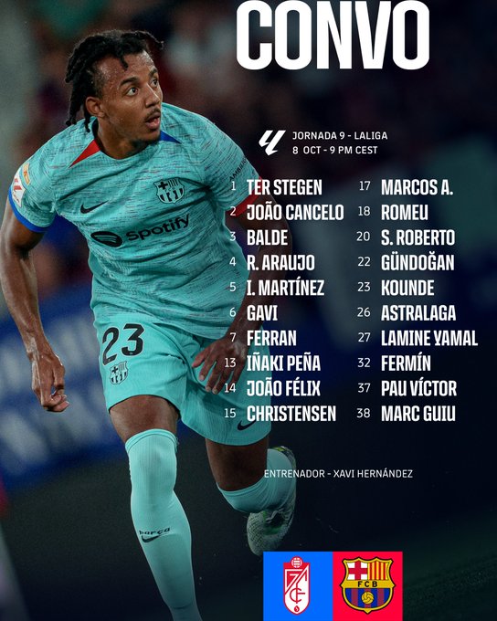 أعلن تشافي هيرنانديز، المدير الفني لفريق برشلونة، عن قائمة فريقه، استعدادا لمواجهة غرناطة، والتي ستُقام غدا الأحد، ضمن منافسات الجولة التاسعة من الدوري الإسباني.