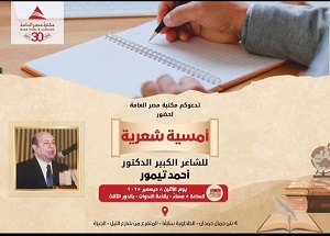 تنظم مكتبة مصر العامة أمسية أدبية تحتفي بجمال الكلمة وسحر القصيدة، يحييها الشاعر الدكتور أحمد تيمور، وذلك غدا الاثنين، في الساعة الخامسة مساء.
