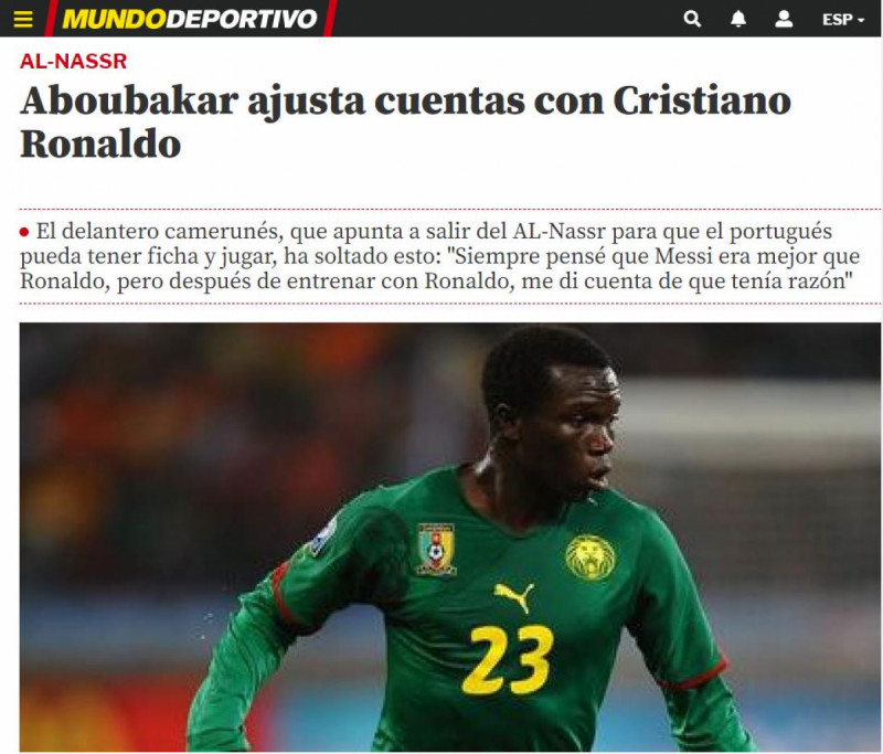 أثار تقرير صحفي إسباني الجدل حول الكاميروني فينسنت أبو بكر، لاعب النصر السعودي السابق، بسبب تصريحات منسوبة إليه سخر خلالها من النجم البرتغالي كريستيانو رونالدو، المنضم لصفوف النصر في فترة الانتقالات الشتوية الحالية.