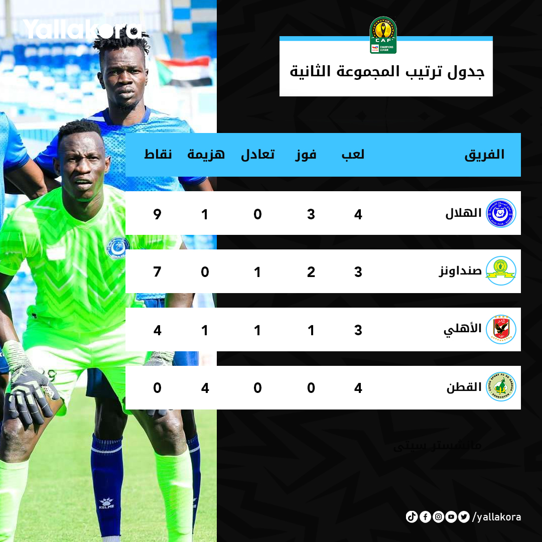 ورفع الأهلي رصيده لـ4 نقاط في المجموعة الأولى لأبطال إفريقيا، بينما يتصدر الهلال الترتيب بـ9 نقاط، وثانيا صن داونز 7 نقاط، والقطن رابعًا بدون نقاط.