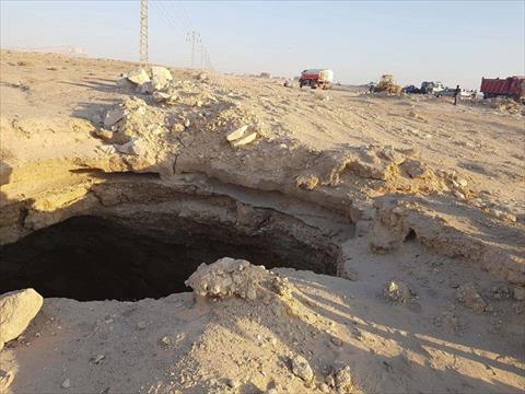 كما جرى تشكيل اللجنة من المختصين وبالمعاينة الظاهرية تبين أن الحفرة (الانهيار الأرضي) سببها وجود جيوب أرضية بالمكان (كهف أرضي)، ونتيجة انهيار الطبقة العليا منه وهي عبارة عن رمال متكلسة حدثت هذه الحفرة، وبالاسترشاد بأحد المواطنين بالمكان من أهل المنطقة تبين وجود حفرة أعمق.
