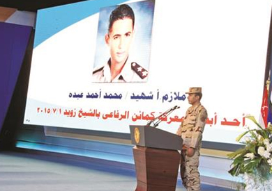 وعرض خلال كلمة الرائد كريم فيلما تسجيليا يروى تفاصيل استشهاد أحد أبطال المعركة الملازم محمد أحمد عبده، وحديث والدته عن اللحظات الأخيرة له فى معركته مع العناصر الإرهابية بسيناء.