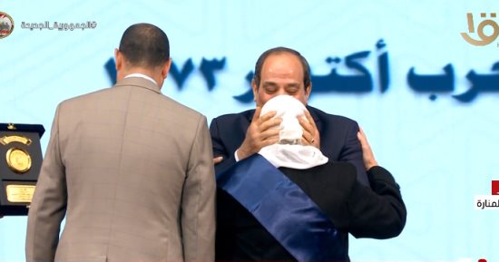 ودار حديث مطول بين الرئيس السيسي وأرملة الشهيد، قبّل خلاله الرئيس رأس السيدة، وحرص على اصطحابها بعد انتهاء حديثهما، حتى النزول من خشبة المسرح.