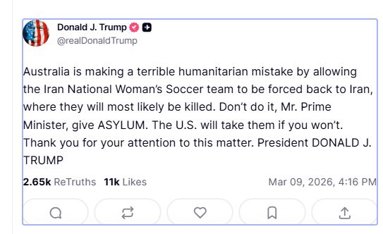 ودعا في تدوينة عبر صفحته الرسمية بمنصة «تروث سوشيال»، اليوم الاثنين، رئيس الوزراء الأسترالي أنتوني ألبانيز، إلى منحهن حق اللجوء، قائلًا إن الولايات المتحدة ستستقبلهن إذا لم تفعل أستراليا ذلك.