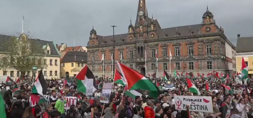 عرضت فضائية «يورونيوز عربية»، مقطع فيديو يرصد لاحتجاجات المتضامنة مع غزة قبيل انطلاق نهائيات مسابقة الأغنية الأوروبية في السويد «يوروفيجن».