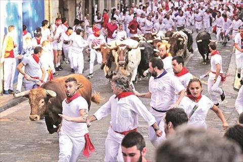 فى مثل تلك الأوقات من كل عام، يرقض مئات الأشخاص، من مدينة بنبلونة بمنطقة نافارا شمال اسبانيا، فى شوارع المدينة هربا من الثيران الغاضبة التى تطلق تكريما للراهب فيرمين.