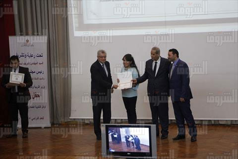 وسط الزغاريد وأغنية "وحياة قلبي وأفراحه" كرم الدكتور الهلالي الشربيني وزير التربية والتعليم، اليوم، أوائل الثانوية العامة والدبلومات الفنية والذي بلغ عددهم 93 طالب للثانوية العامة و20 طالب للدبلومات الفنية، وذلك بحضور اللواء محمد العصار وزير الإنتاج الحربي.