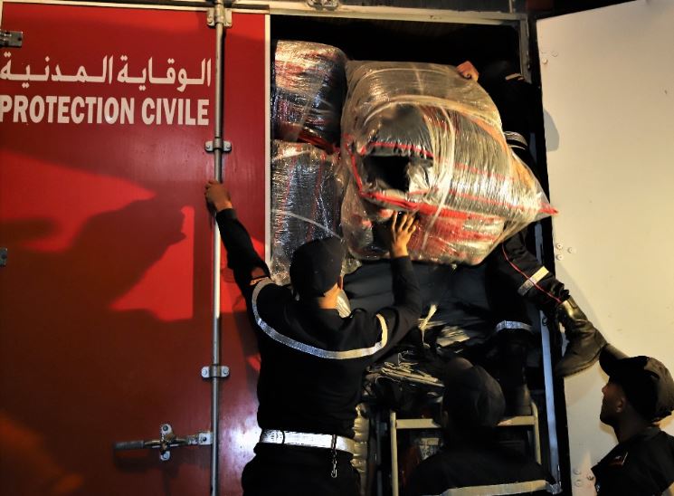 وعمل فريق من عناصر الوقاية المدنية، في الساعات الأولى من صباح اليوم السبت، وبسرعة فائقة، على تحميل الشاحنات من أجل إيصال المساعدات في أسرع وقت ممكن إلى السكان المتضررين من الزلزال.