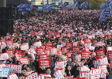 وطالب المتظاهرون اليوم أيضا باستقالة الرئيس مون جان إن، عقب أن تعرض لضغوطات الشهر الماضي من المعارضة لتعيين تشو "54 عاما" في المنصب الوزاري.