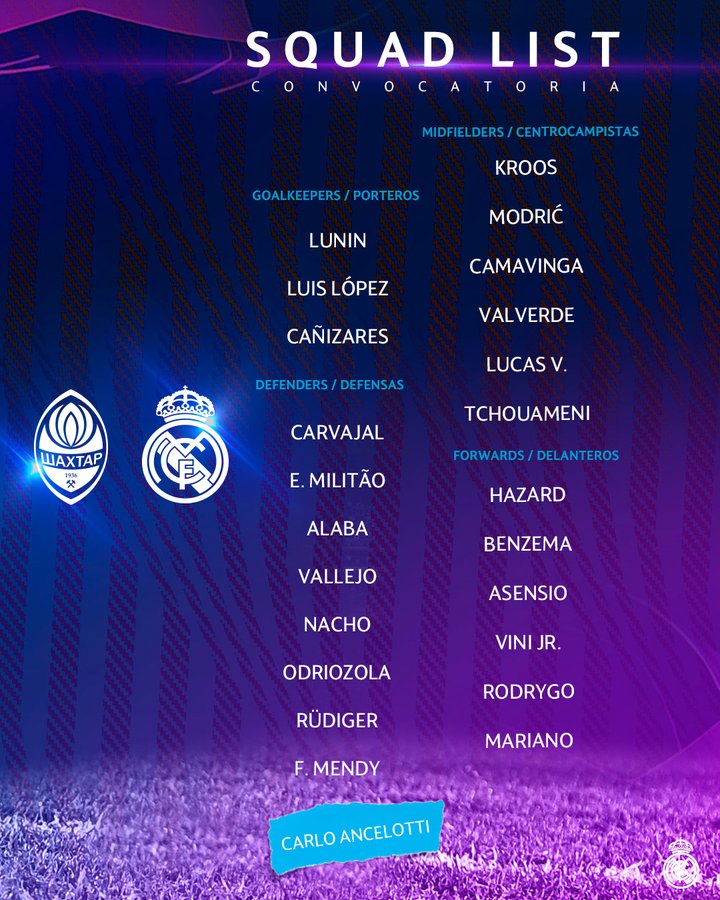 وشهدت قائمة ريال مدريد عودة المهاجم كريم بنزيما، بينما يغيب تيبو كورتوا وداني سيبايوس.