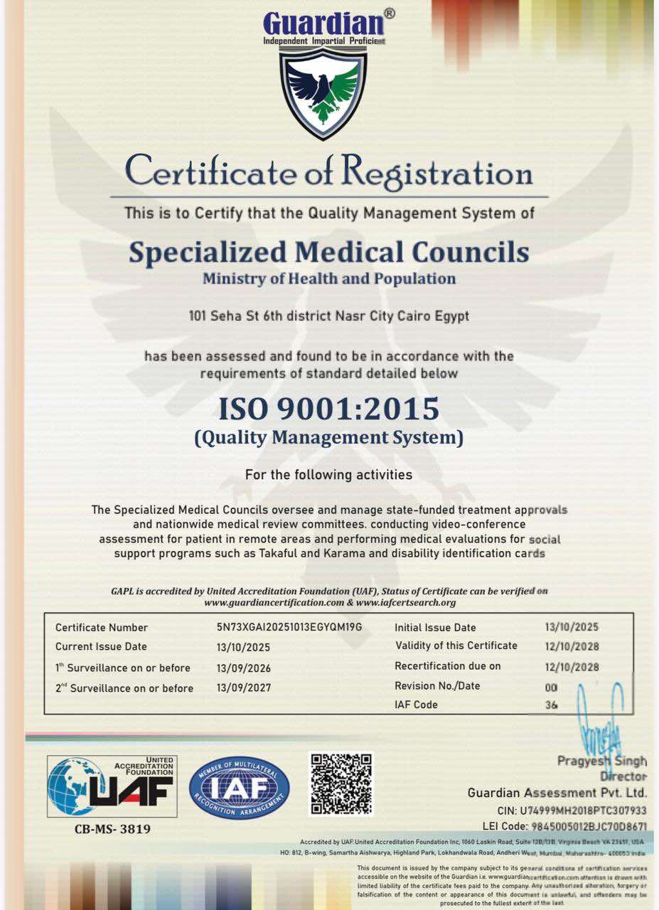 الصحة: حصول الإدارة العامة للمجالس الطبية المتخصصة على شهادة الاعتماد الدولي لنظام إدارة الجودة