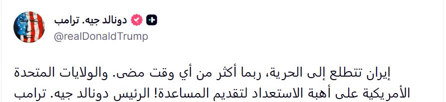 قال الرئيس الأمريكي دونالد ترامب إن إيران تتجه نحو الحرية «ربما كما لم يحدث من قبل»، مؤكدًا أن الولايات المتحدة تقف على أتم الاستعداد للمساعدة.