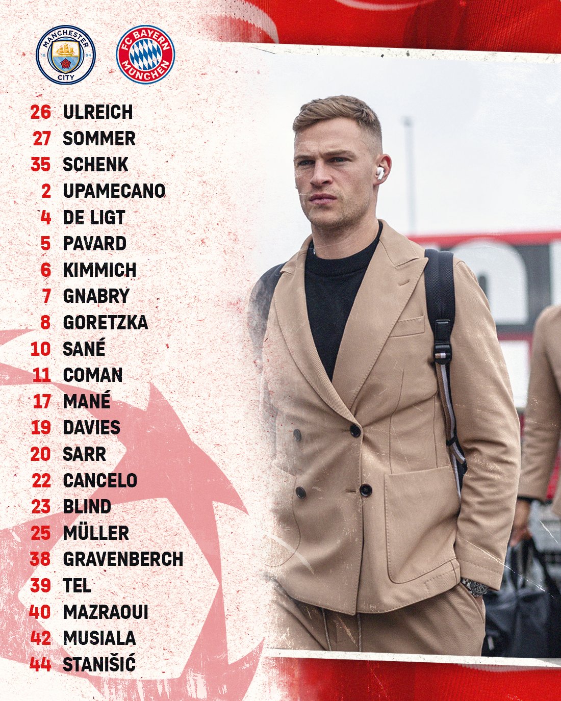 وشهدت قائمة الفريق البافاري غياب إيريك ماكسيم تشوبو موتنج، حيث أصدر النادي بيانا صباح اليوم الإثنين غياب تشوبو مونتج للإصابة والتي على إثرها لن يقدر على السفر رفقة الفريق إلى أنجلترا لخوض مباراة المان سيتي.